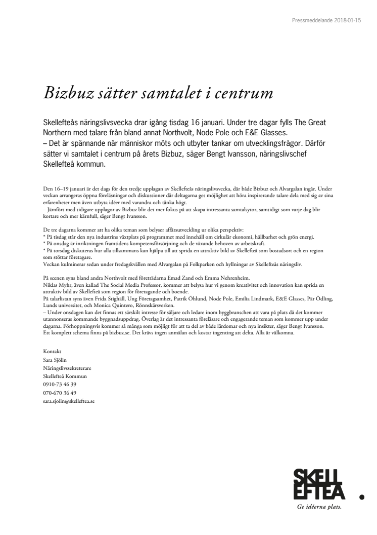 Den 16–19 januari är det dags för den tredje upplagan av Skellefteås näringslivsvecka, där både Bizbuz och Alvargalan ingår. Under veckan arrangeras öppna föreläsningar och diskussioner där deltagarna ges möjlighet att höra inspirerande talare dela med sig av sina erfarenheter men även utbyta idéer med varandra och tänka högt.